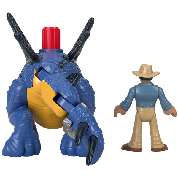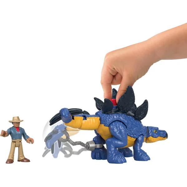 Stegosaurus aux membres articulés et à fonction souhaite se libérer de son harnais pourtant surveillé par Dr. Grant. Compatible avec le Camion de Capture Imaginext. Tiré de Jurassic World : Le monde d’après.