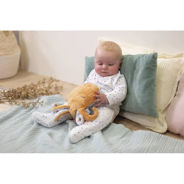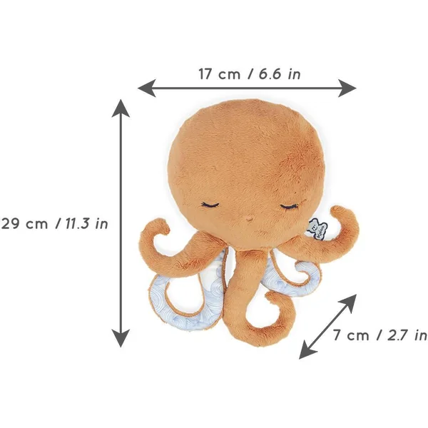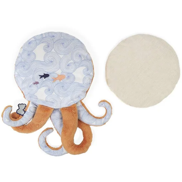 La peluche bien-être poulpe est la peluche parfaite pour aider à faire passer les petits maux de bébé. Déhoussable, elle contient une poche amovible. La poche garnie de billes en argile et fleurs de lavande est à placer au micro-ondes ou au congélateur pour un effet chaud ou froid. L’accès à la poche est sécurisé grâce à un système de velcros pour une utilisation sans risques. En fourrure toute douce, elle apportera toute la douceur dont bébé aura besoin dès la naissance. La face arrière est habillée d’un imprimé « Danse des vagues » agrémenté de broderies de poissons qui rappellent le calme des profondeurs marines et l’onde de douceur et de bien-être apportées par la peluche bien-être. Sa taille généreuse est idéale pour réchauffer votre enfant dans son lit et soulager ses maux. Sans poche, la peluche poulpe enveloppera bébé de réconfort avec ses doux tentacules pour devenir son meilleur compagnon à câliner. Veuillez retirer la poche avant lavage en machine. Mode d’emploi inclut à l’intérieur de la peluche. La bouillote a de nombres bienfaits. La lavande aide à la relaxation et à l’endormissement grâce à ses propriétés calmantes et apaisantes. Dimensions : 29 cm x 17 cm –