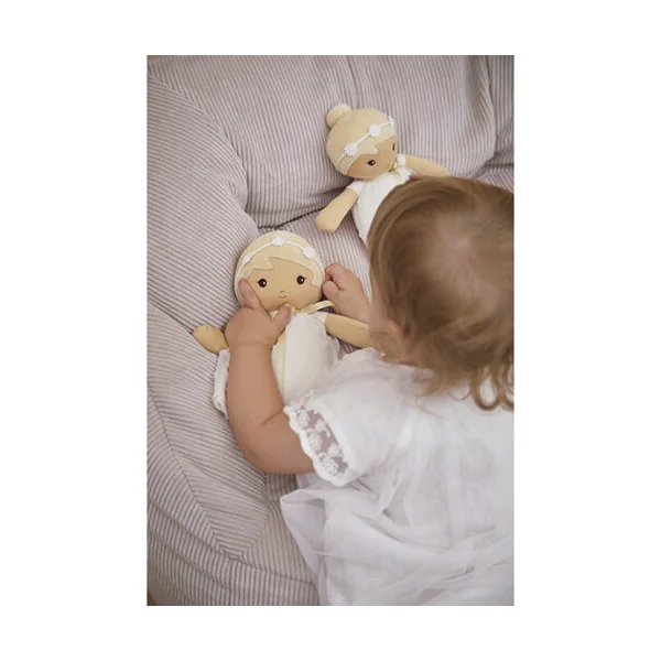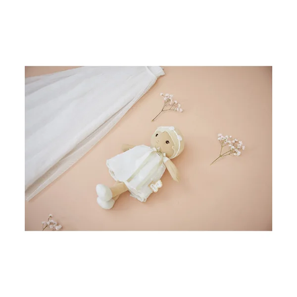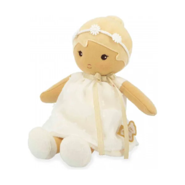Convient aux bébés dès la naissance, elle fait partie de la collection de poupées Kaloo Tendresse. Élégamment vêtue d’une robe en organza à pois ivoire, Daphne est prête à célébrer des moments précieux, tels que des baptêmes ou des mariages. Son chignon soigneusement coiffé ajoute une touche d’exception, et ses chaussures assorties complètent son apparence raffinée et élégante. Daphne est une poupée qui reflète la pureté et la douceur des moments précieux. Son ensemble éthéré est rehaussé d’une délicate couronne de fleurs, qui est comme une touche finale de poésie. Avec son regard paisible et son apparence douce, Daphne invite à la tendresse et au rêve.