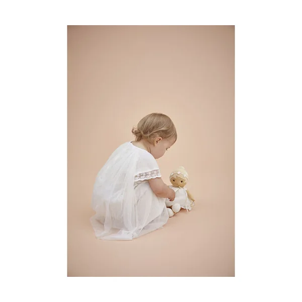 Élégamment vêtue d’une robe en organza à pois ivoire, Daphne est prête à célébrer des moments précieux, tels que des baptêmes ou des mariages. Son chignon soigneusement coiffé ajoute une touche d’exception, et ses chaussures assorties complètent son apparence raffinée et élégante. Daphne est une poupée qui reflète la pureté et la douceur des moments précieux. Son ensemble éthéré est rehaussé d’une délicate couronne de fleurs, qui est comme une touche finale de poésie. Avec son regard paisible et son apparence douce, Daphne invite à la tendresse et au rêve.