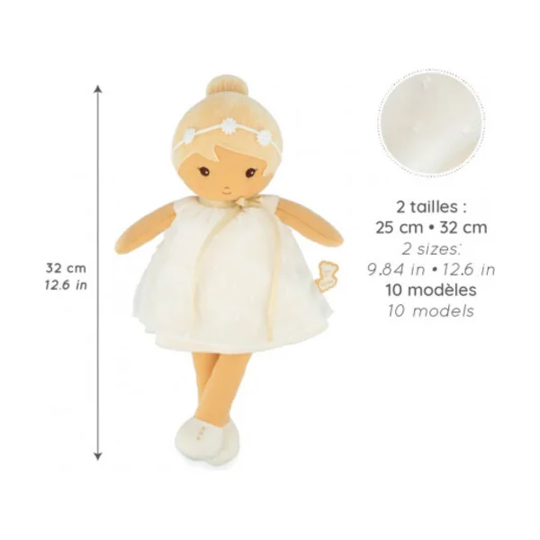 Il est temps de faire connaissance avec Daphne : une belle poupée en tissu de 32 cm, élégante ! Convient aux bébés dès la naissance, elle fait partie de la collection de poupées Kaloo Tendresse.