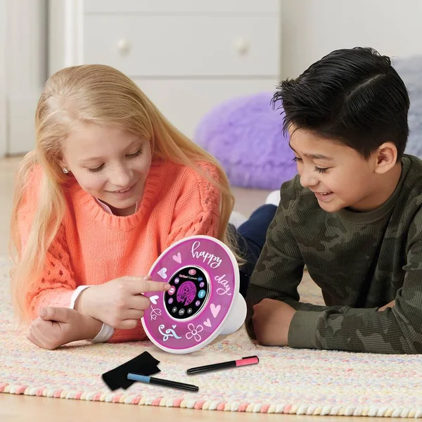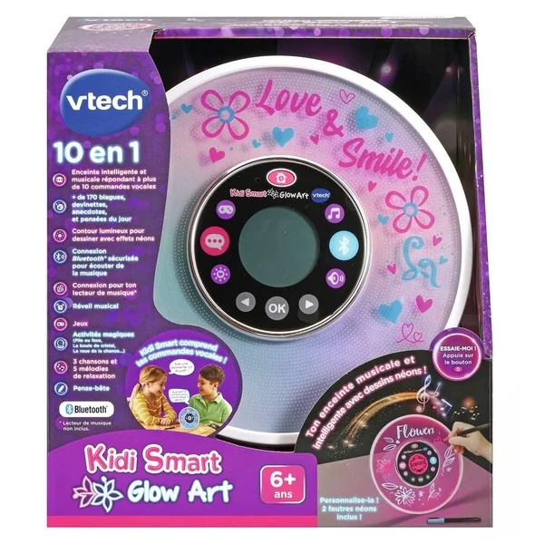 KidiSmart Glow Art. Une enceinte 100 % personnalisable avec reconnaissance vocale ! L’enfant peut écrire et dessiner à l’infini sur le contour de l’enceinte avec les feutres effet néon. Les variations lumineuses font briller les dessins, et dans le noir, effet fluorescent garanti ! Magique, KidiSmart Glow Art répond à plus de 10 commandes vocales : Kidi quelle heure est-il, Kidi change de couleur …! Enceinte musicale : Possibilité d’écouter ses musiques préférées grâce la connexion bluetooth sécurisée. Ecran rétro-éclairé avec fonctions horloge parlante et réveil mais aussi 7 jeux 8 mélodies et musiques déja intégrées 2 feutres néon et un tissu microfibre inclus. fonctionne avec piles ou adaptateur non inclus.