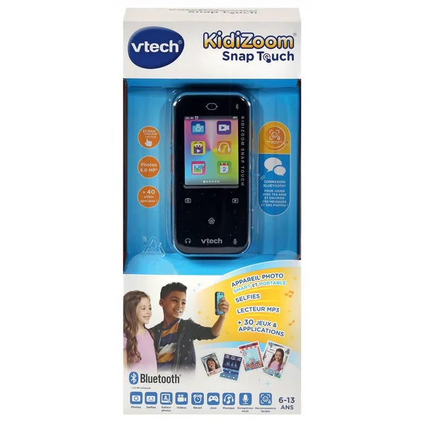 Un KidiZoom format smartphone à glisser dans la poche ! Un KidiZoom au format smartphone 100% tactile à glisser dans la poche ! Écran tactile LCD de 2.4 » et 5 touches de commandes tactiles pour naviguer comme sur un smartphone. Son double objectif permet de prendre des photos et vidéos avec ses amis ou en selfie jusqu’à 5 MégaPixels. Les filtres et effets disponibles permettent de personnaliser ses photos et les rendre plus fun. • Comme un vrai smartphone, il se débloque grâce à sa fonction de reconnaissance faciale. Grâce à sa fonction Bluetooth, il permet à l’enfant de communiquer et de jouer avec ses amis sur un autre KidiZoom Snap Touch (jusqu’à 10m de distance). Prise casque pour brancher ses écouteurs et lecteur MP3 inclus avec port de carte MicroSD (non-incluse) pour ajouter et écouter ses musiques. 6 jeux dont 3 jeux à jouer à 2. 2 coloris disponibles. Arrêt automatique.