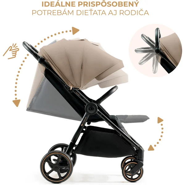La MITZY protégera votre enfant pendant la promenade – le grand canopy imperméable dispose d’un filtre UPF50+, qui protège encore plus votre petit des rayons UV. Il a un panneau de ventilation pour aérer pendant les fortes chaleurs et une fenêtre pour garder le contact avec l’enfant. Vent, pluie – rien de tout cela n’est un problème pour cette poussette.