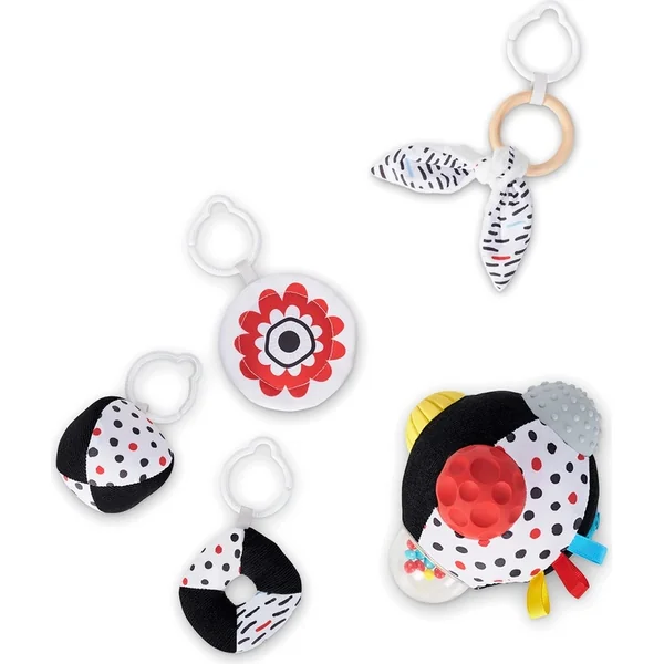 4 la concentration - L’emballage contient de nombreux jouets qui stimulent les sens : 12 cartes contrastées, un miroir suspendu, une balle suspendue avec un hochet, un jouet crissant suspendu, une balle sensorielle, un jouet en peluche, des bandes colorées, des billes bruyantes et un miroir qui peut être placé derrière le film.