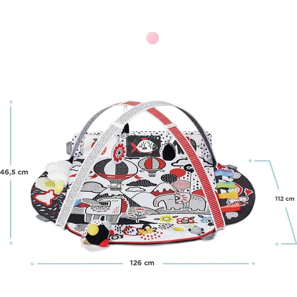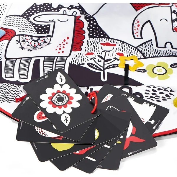 L’emballage contient 2 arches avec un curseur confortable, vous pouvez y placer et déplacer librement les jouets fournis : 12 cartes d’apprentissage 4SMART, un miroir suspendu, une balle suspendue avec un hochet, un jouet crissant suspendu, une balle sensorielle, un jouet en peluche, des bandes colorées, des billes bruyantes et un miroir qui peut être placé derrière le film. Vous pouvez accrocher les cartes par exemple sur la poussette ou le sac à dos. De plus, l’emballage comprend également une balle sensorielle. Elle est grande, a différentes couleurs, boutons et motifs, ce qui attire le regard du petit et lui apporte beaucoup de joie. Grâce à son motif intéressant et à son style ainsi qu’à sa multifonctionnalité, c’est une couverture idéale pour chaque enfant.