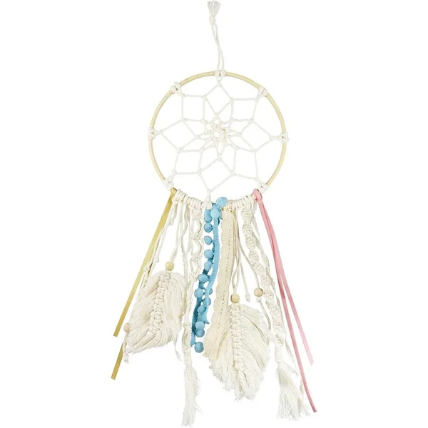 Créez votre propre attrape-rêves magique grâce à la technique du macramé ! Ce kit contient tout le nécessaire pour fabriquer un élégant attrape-rêves, y compris un cercle en bois de 19 cm de diamètre, du fil écru, des rubans en dentelle, des perles en bois, un ruban doré et un peigne.