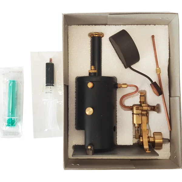 L’emballage contient une machine à vapeur, une seringue avec de l’huile pour lubrification, une seringue de rechange, un tube pour l’évacuation de l’eau résiduelle, un mode d’emploi en allemand.