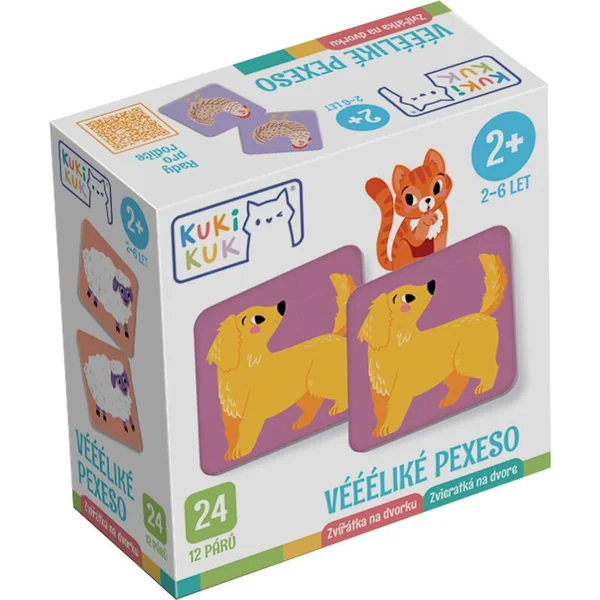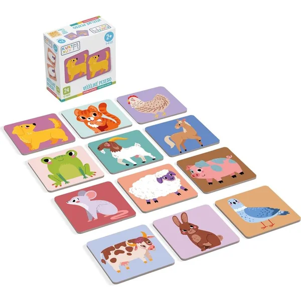 Le jeu éducatif amusant Vééliké pexeso Animaux de la cour apprend aux tout-petits à découvrir le monde de leurs amis préférés. Le set comprend 24 pièces de cartes de 11 x 11 cm en carton de 2 mm d’épaisseur.