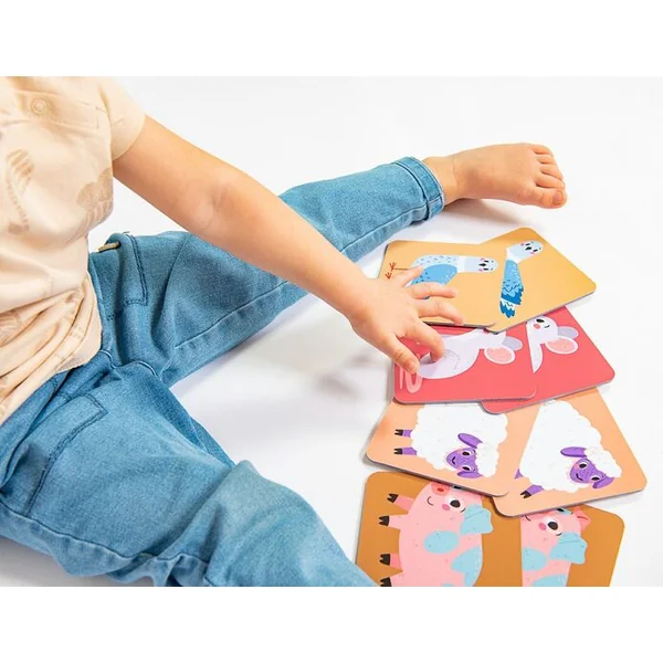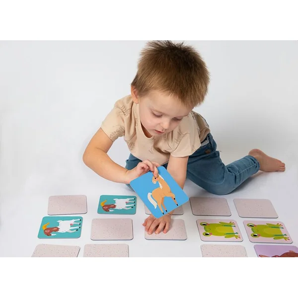 Choisissez 6 cartes différentes du set et placez-les face visible. Donnez la deuxième carte du couple à l’enfant. Demandez-lui d’associer correctement les cartes. Augmentez progressivement le nombre à 9 cartes, puis à toutes les 12 cartes. Lors de l’association des cartes en paires, vous pouvez progressivement ajouter d’autres tâches : Comment s’appellent les animaux ? Qui a un pelage ? Qui a des plumes ? Qui a des sabots ? Qui a des pattes ? Qui a un bec ? Amusez-vous à imiter les sons des différents animaux. Certains animaux émettent des sons avec leurs mouvements, imitez-les (le cheval tape du sabot, le chat gratte à la porte, le lapin saute dans son clapier). Pratiquez les noms de toute la famille animale : poules – poussin – coq ; chèvre – chevreau – bouc. Créez différentes diminutifs pour nommer les animaux : ils sont mignons et ont une plus grande charge émotionnelle.