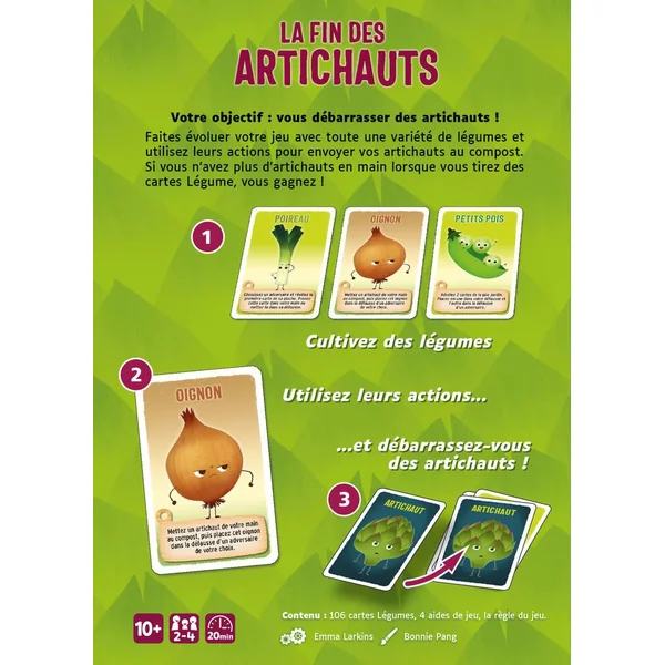 Le premier joueur qui pioche 5 cartes de son deck sans aucun artichaut remporte la partie.