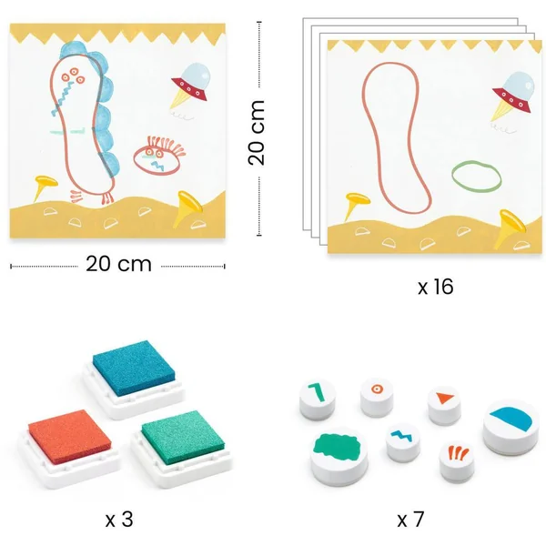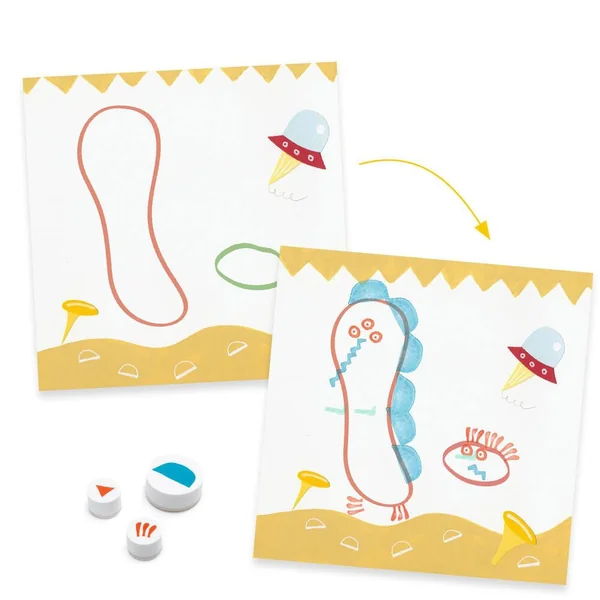 Un coffret de tampons sur le thème des monstres où l’enfant décore librement les cartes illustrées. Progressivement, il encre les tampons et marque les empreintes pour animer les décors proposés. L’enfant s’amuse à modifier les combinaisons en laissant libre cours à son imagination. Toujours différentes, les saynètes prennent vie !
