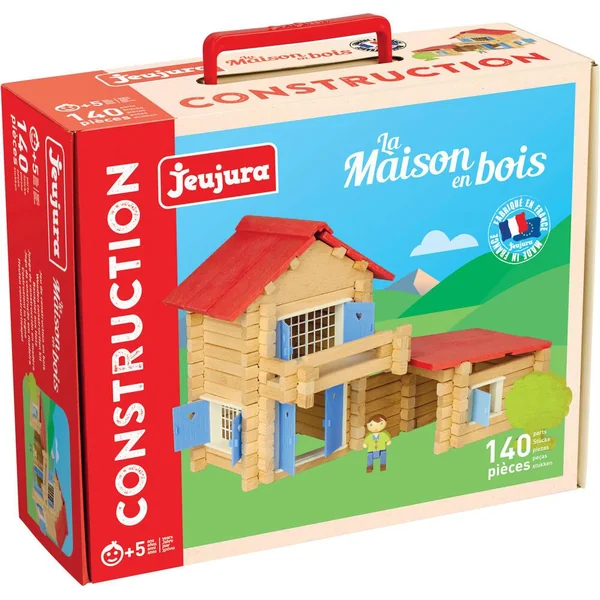 La Maison en Bois – 140 pièces : jeu de construction en bois naturel et teinté avec une notice de montage. Valisette carton : 32 x 27 x 11 cm.