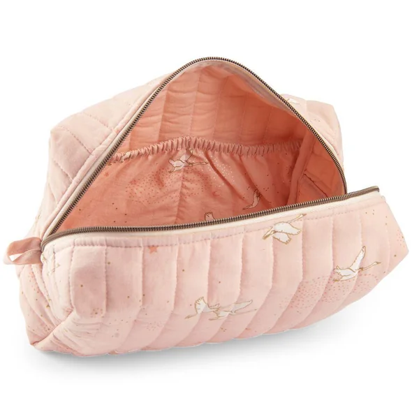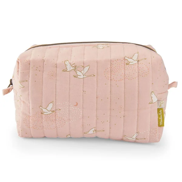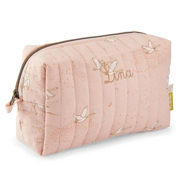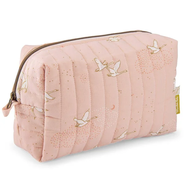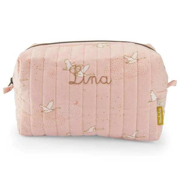 Trousse de toilette avec un imprimé rose poudré. Nomade avec une fermeture cuivre zippée, elle est une belle pièce qui completera le nécessaire de bébé pour une toilette pratique et poétique.