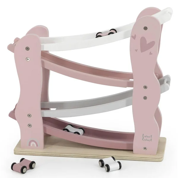 Cette glissade amusante de voiture de Label Label est faite de bois de hêtre certifié FSC de qualité et a été décorée avec de belles nuances roses/blanches/grises utilisant de la peinture à base d’eau non nocive pour les enfants.