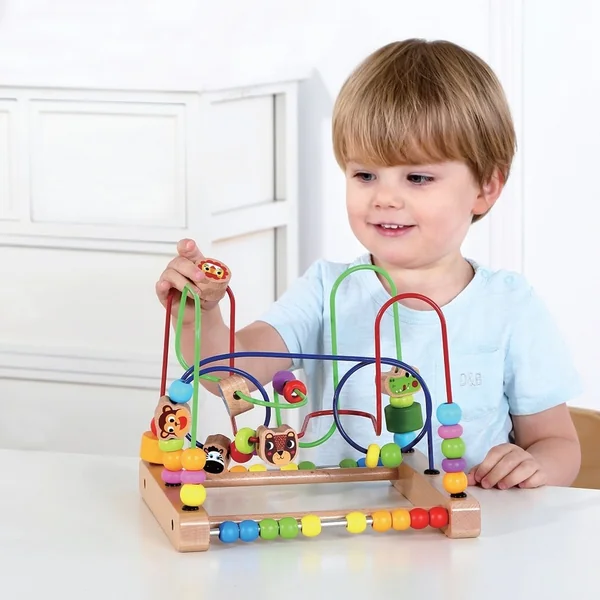 Le labyrinthe sur un support en bois aide les enfants non seulement à se familiariser avec les couleurs, mais surtout à entraîner leur motricité fine en déplaçant les perles.