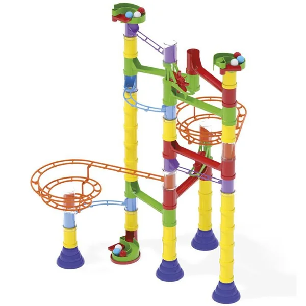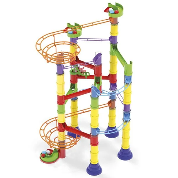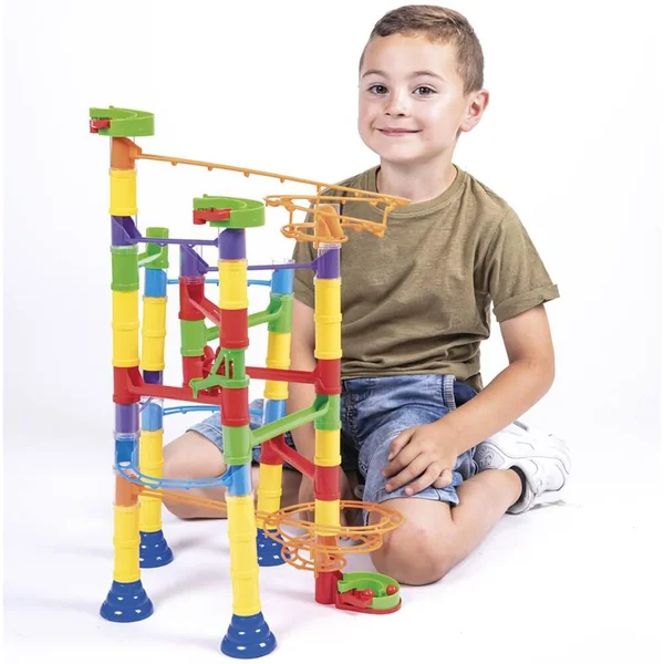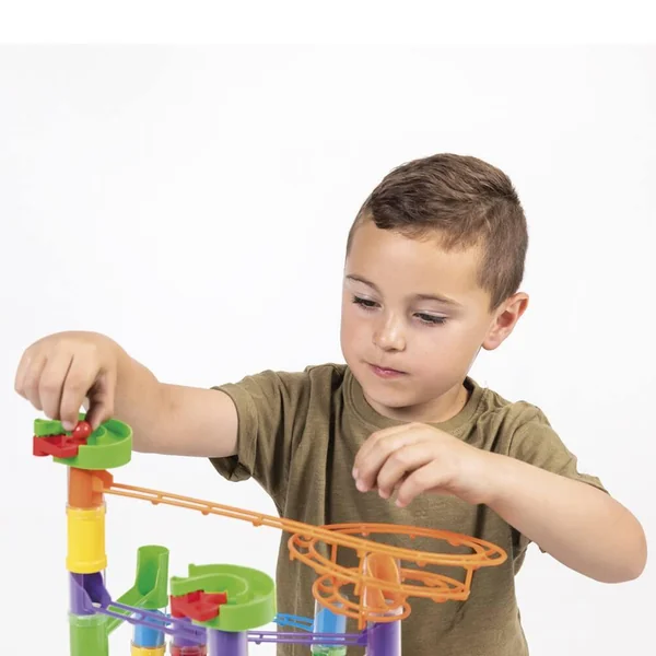 85 pièces au total, dont 12 billes. Reproduit le circuit illustré sur la boîte ou crée une nouvelle course. Les différents éléments s’emboîtent facilement et permettent de construire des combinaisons infinies. Jouet scientifique. Pour expérimenter le fonctionnement des sciences dynamiques, énergétiques et mécaniques ! Avec un lanceur à billes et un tourniquet. Construis-le toi-même (D.I.Y.). Assemblage facile. Développe la créativité. Pour exemple, dimensions d’un circuit monté : 50 x 30 x 70 cm. Notice incluse.
