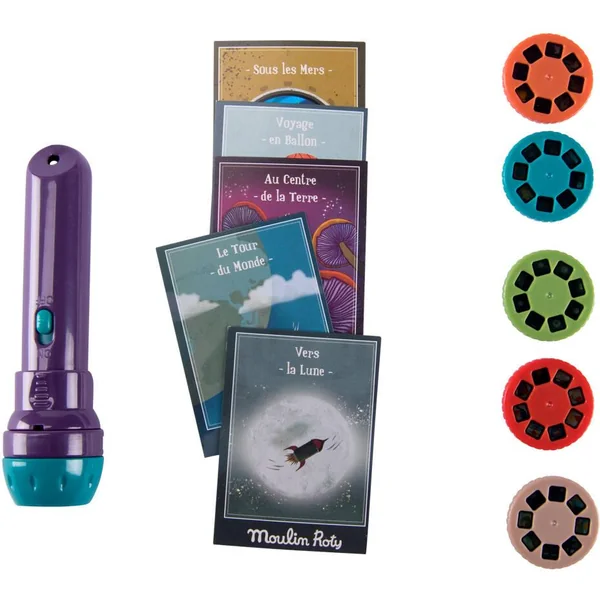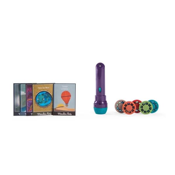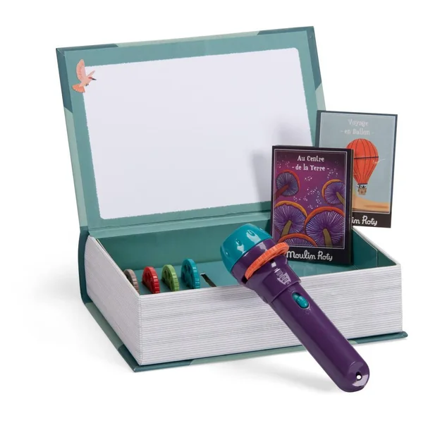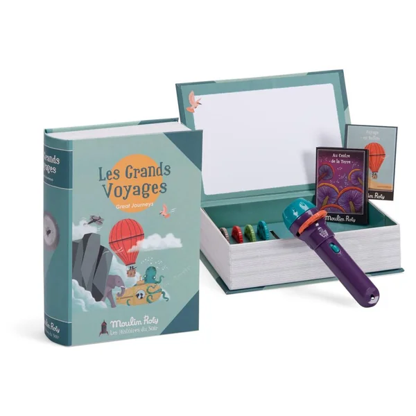 Coffret avec écran de projection, joliment illustré ! Conçu comme un livre, contient une lampe à projeter, 5 disques sur l’univers des grands voyages et 5 cartes postales. Développe l’imaginaire des petits et offre de précieux moments de complicité.