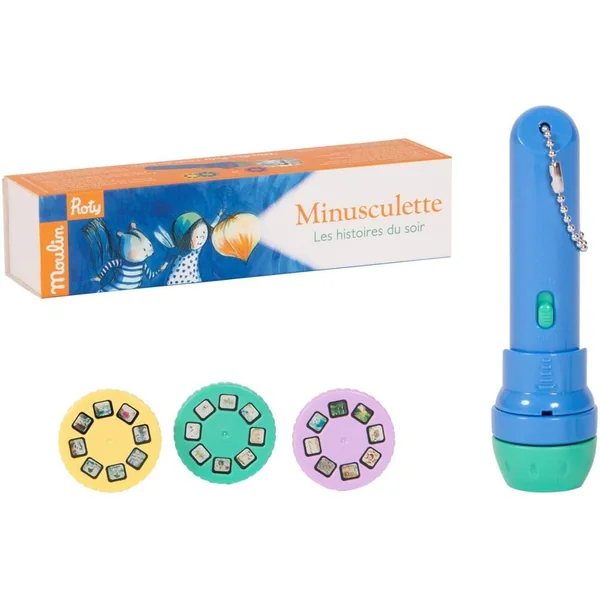 Lampe torche de poche où chacun des 3 disques projetés sur le mur raconte les aventures de Minusculette, une petite héroïne féérique de l’école des loisirs. Pour endormir les tout-petits et développer leur imagination !
