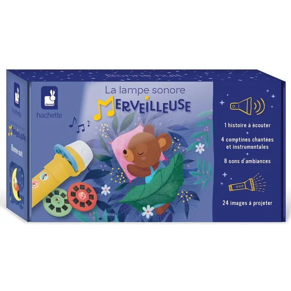 La durée sonore totale est de 537 secondes. La boîte contient une lampe, 3 rondelles qui correspondent chacune aux 3 boutons de la lampe et contenant 8 images, ainsi qu’un pochon de rangement en coton. La lampe fonctionne grâce à 2 piles AAA, non incluses. Cette lampe peut être utilisée en autonomie ou accompagnée d’un parent au moment du coucher.