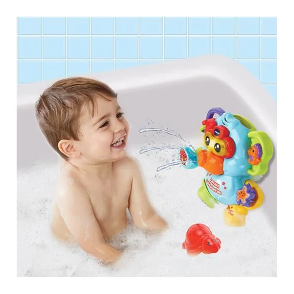 Lancelot, l’éléphant’eau. De 1 à 5 ans. Lorsque Bébé verse de l’eau sur la tête de l’éléphant à l’aide du verseur-tortue, Lancelot l’asperge par sa trompe. En appuyant sur le bouton yeux lumineux, Bébé déclenche de nombreuses phrases, des chansons, des mélodies et des sons amusants. Bébé développe sa motricité en manipulant les six éléments situés sur les pattes et les oreilles de l’éléphant. Un verseur-tortue inclus. Grâce aux deux ventouses situées dans son dos, Lancelot est solidement attaché à la baignoire pour jouer avec Bébé. Plus de 45 phrases, chansons, mélodies et sons amusants. 4 chansons et 15 mélodies. Arrêt automatique. Pile de démonstration fournie