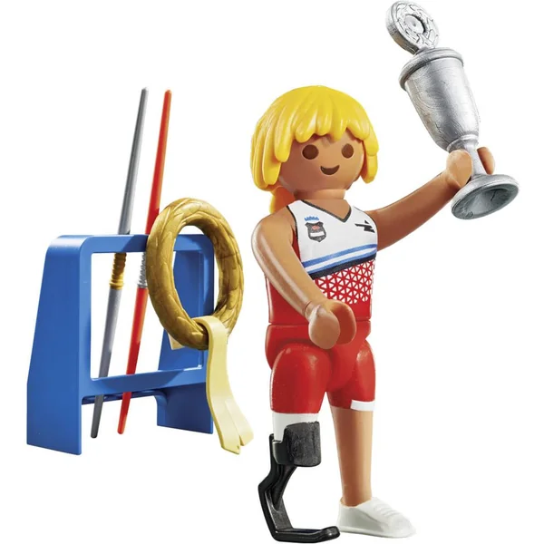 Préparez-vous à lancer l’aventure avec notre lanceur de javelot ! Vivez des sensations fortes et repoussez vos limites dans des compétitions palpitantes. Prêt à viser la victore ? Ce set PLAYMOBIL Special Plus comprend un athlète paralympique dôté d’une jambe prothétique qui est heureux de remporté le lancer du javelot ainsi que des accessoires.