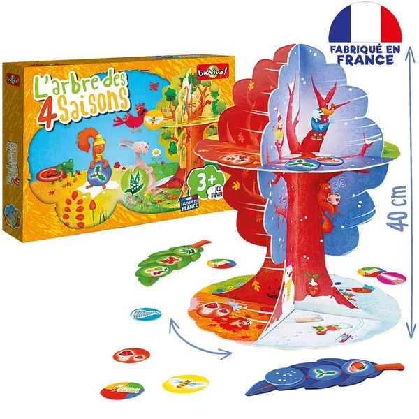 Mémorise et retrouve les fruits et légumes correspondant au printemps, à l’été, à l’automne ou à l’hiver. Sois le plus habile afin de compléter ta saison mais attention aux vents et au bucheron… La boîte contient 1 arbre en 3D , 18 jetons, 4 livrets aide mémoire et 1 livret pédagogique. Durée de la partie : 20 mn. De 1 à 4 joueurs.