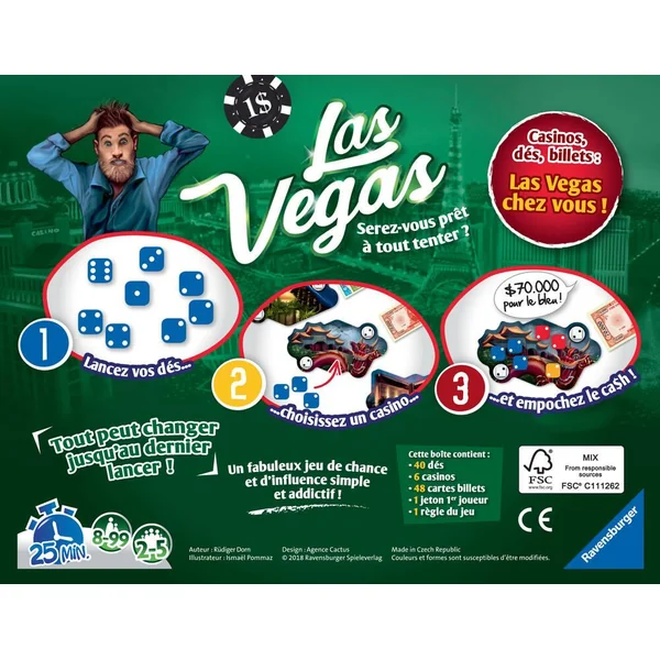 Dans « las Vegas », la stratégie est reine. Lancez vos dés avec prudence et placez les astucieusement pour accumuler le plus de cash possible. Cependant, dans cet univers où chaque décision compte, le risque de tout perdre est bien réel. C’est un jeu qui mêle habilement chance et stratégie, tout en offrant une expérience conviviale et engageante.