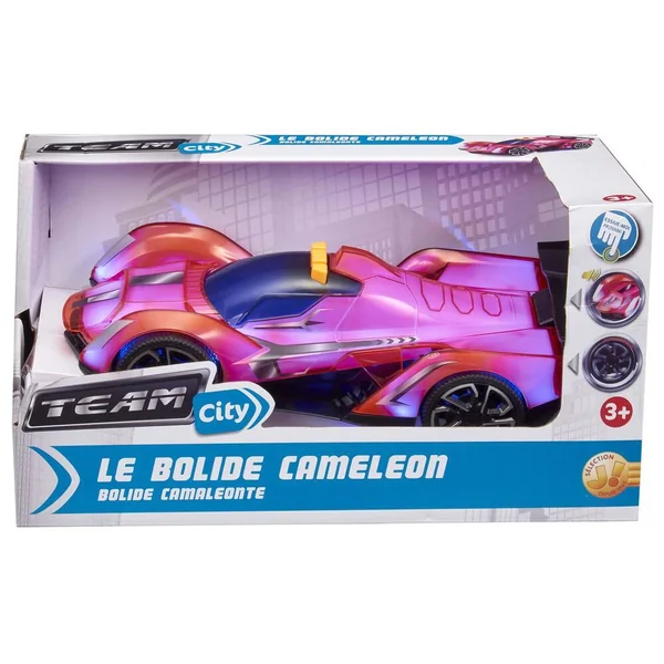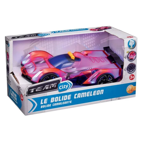 Prêt pour faire la course avec ce véhicule changeant de couleur ! Avec effets sonores et lumineux. Appuie sur le bouton pour voir la voiture changer complètement de couleur pendant qu’elle avance. Le véhicule passe du rouge au violet. Les autres boutons te permettent d’activer de la musique et des bruits de moteur réalistes. En plastique.