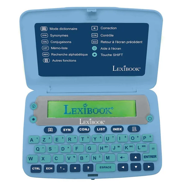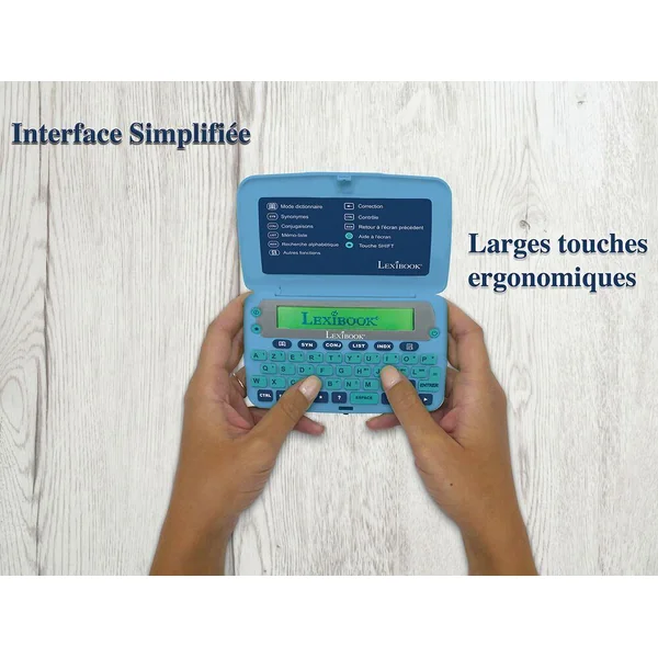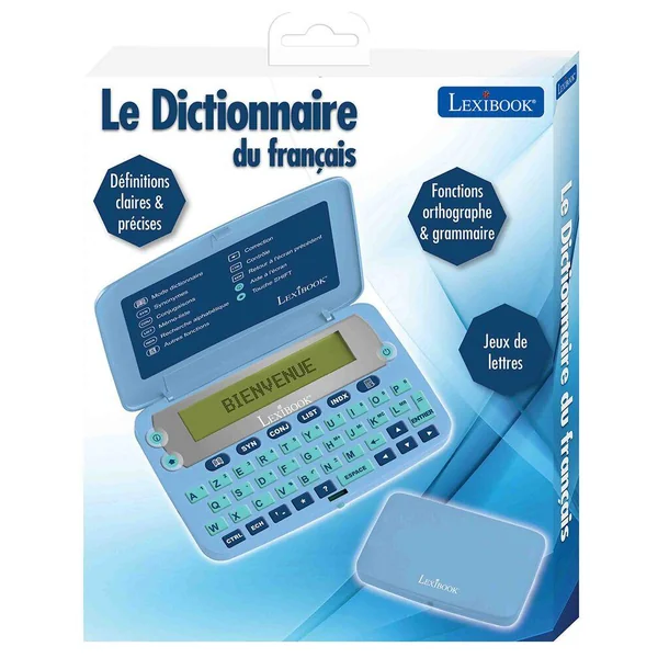 Fonction loupe pour une lecture plus facile (3 lignes géantes). 65 000 mots racines. Définition complète de tous les mots du dictionnaire, jusqu’à 6 définitions par mot. Correcteur d’orthographe des noms communs : plus de 3 millions de corrections. Dictionnaire des synonymes : plus de 250 000 propositions et fonction grammaticale : 9 000 verbes conjugués sur 10 temps. Index permettant de rechercher les noms propres. Nature et genre des mots. Pluriel et genre contraire. Jeux du Pendu et du Méli-mélo et résolution des jeux de lettres : mots croisés et anagrammes. Liste mémo permettant de noter certains mots afin d’en retrouver rapidement la définition. 1 pile CR2032 fournie