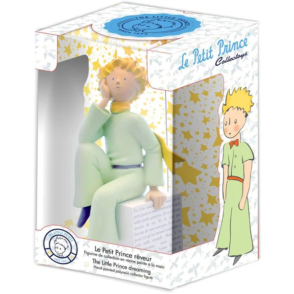 Les yeux tournés vers le ciel, le Petit Prince rêve, la tête dans les étoiles… Des extraits du texte original ornent le cube sur lequel il est assis, comme une invitation au rêve… Retrouvez toute la poésie de l’univers du Petit Prince grâce à cette belle figurine en résine.