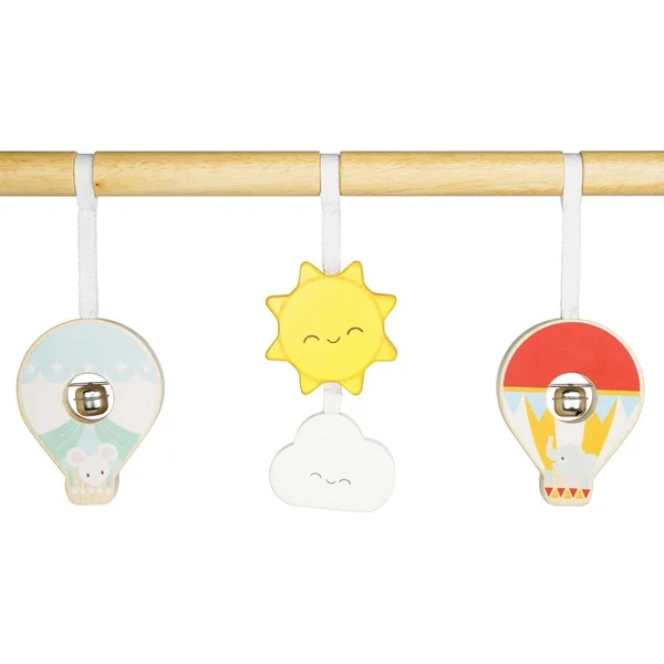Jouet d’éveil adorable pour enfants, stable, fabriqué en bois de caoutchouc naturel avec des bords arrondis. Sa décoration comprend un nuage, des montagnes, des ballons à air chaud colorés suspendus à un cordon en tissu. Les jouets tintent grâce à des grelots. Sur les côtés, il y a des compteurs colorés qui font du bruit. Le jouet d’éveil combine du bois naturel avec des couleurs pastel et vives.