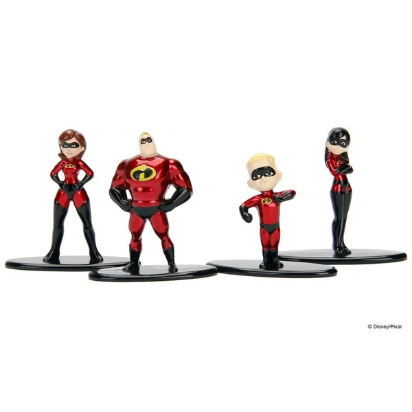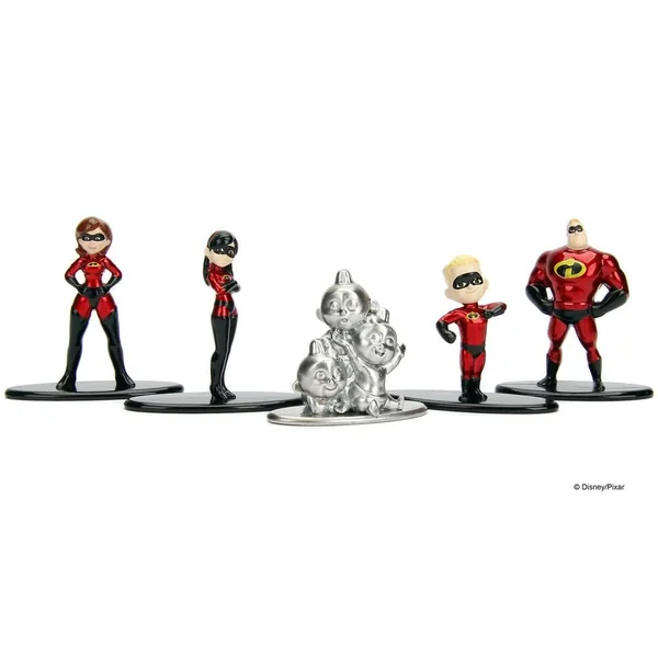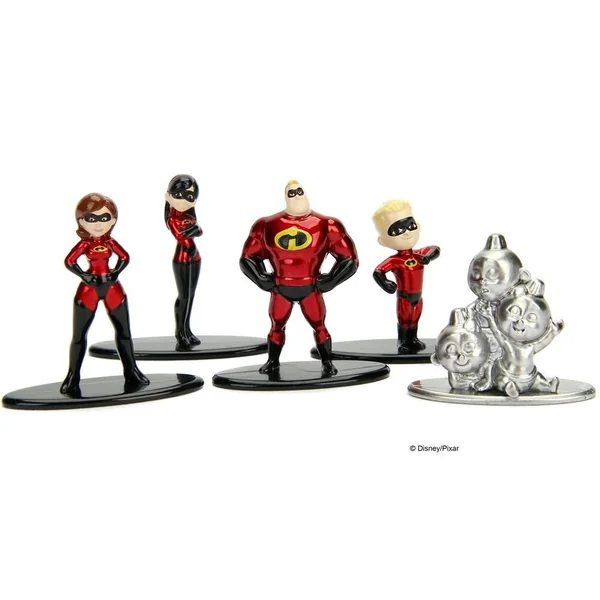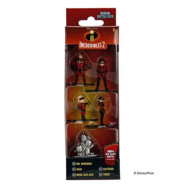 Pack de 5 figurines Nano Metalfigs Disney Pixar Les Indestructibles. Die-Cast : M. Indestructible, Mme Indestructible (ou Elastigirl), Violette, Flèche et Jack-Jack. En métal. Hauteur d’une figurine : 4,2 cm environ.