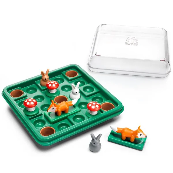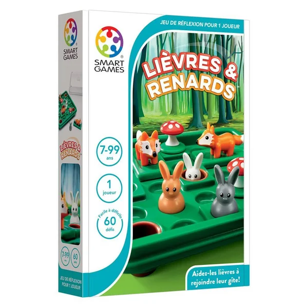Aidez- les lièvres à rejoindre leur gîte ! Trouvez le bon parcours afin de mettre les lièvres à l’abri. Utilisez les autres lièvres, champignons et renards comme autant d’obstacles par-dessus lesquels bondir pour cacher les lièvres dans leur gîte. Un coffret de jeu parfait pour les voyages proposant 60 défis de niveau de difficulté croissant. Jeu de reflexion pour un joueur. Comment jouer ? Choisissez un défi. Placez les Lièvres, Renards et Champignons sur le plan de jeu comme indiqué. Les premiers défis se jouent sans les Renards. Le but du jeu consiste à déplacer les Lièvres par des bonds successifs vers la sécurité, c’est-à-dire dans leurs gîtes, les trous marrons du plan de jeu. Les Renards pourront également être déplacés mais de façon linéaire. Les Champignons ne bougent pas ! Vous avez trouvé la solution lorsque tous les Lièvres sont dans un gîte.