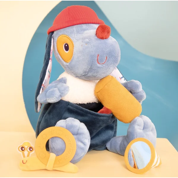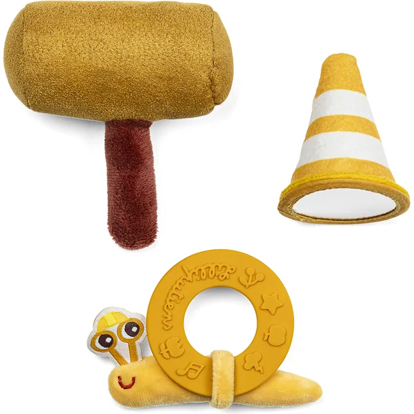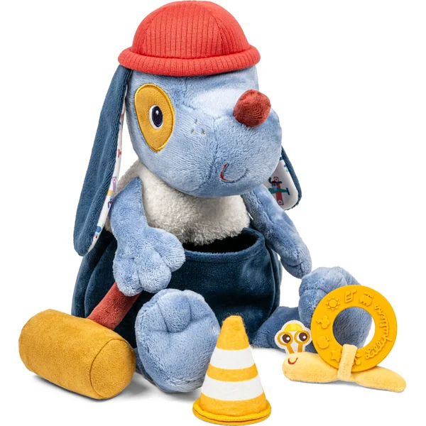 Petite réparation ? Grand projet ? Voici le chien de maintenance Jules. Ce jouet en peluche est adapté aux enfants à partir de 9 mois. Avec ce mignon petit chien bleu, les enfants développent leurs compétences motrices et leur imagination, tout en stimulant leurs sens, tels que l’ouïe et la vue. Dans la poche sur le ventre, il est possible de ranger tous les outils nécessaires pour les bricoleurs – un cône rayé avec un miroir en dessous, un hochet crissant en forme de marteau et un petit escargot, qui est le copain de Jules ! L’anneau de dentition en silicone au dos de l’escargot aide à soulager la douleur des poussées dentaires. Ce chien en peluche peut être lavé en machine à 30 °C sur cycle délicat. Le cône, le marteau et l’escargot ne sont cependant que lavables en surface.