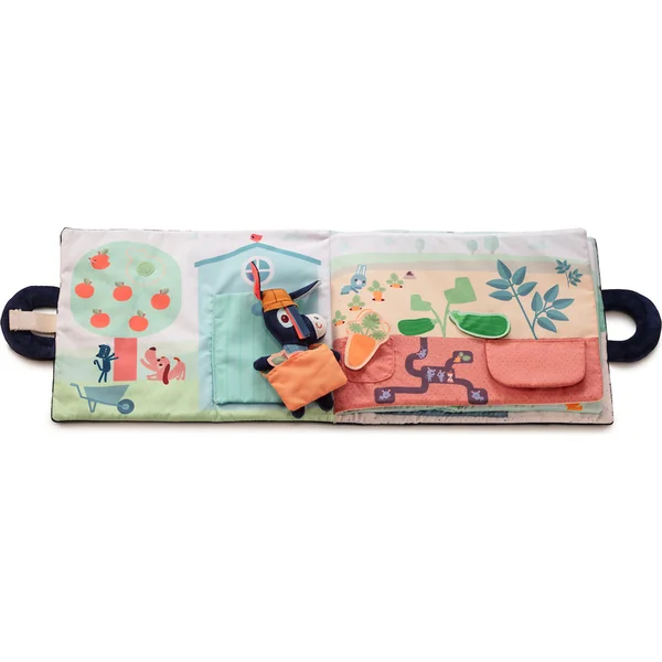 Ignace, le petit âne, attend une journée difficile à la ferme. Il cueille des fruits, traite les vaches, ramasse des œufs dans le poulailler, tond les moutons et ensuite il va au marché vendre ses produits. Ignace sera reconnaissant pour un petit coup de main. Dans ce livre en tissu, votre enfant peut se transformer en petit apprenti fermier et participer aux activités. Il apprendra beaucoup de choses sur la vie à la ferme. Le livre comprend également une petite figurine de l’âne Ignace et plusieurs autres accessoires.