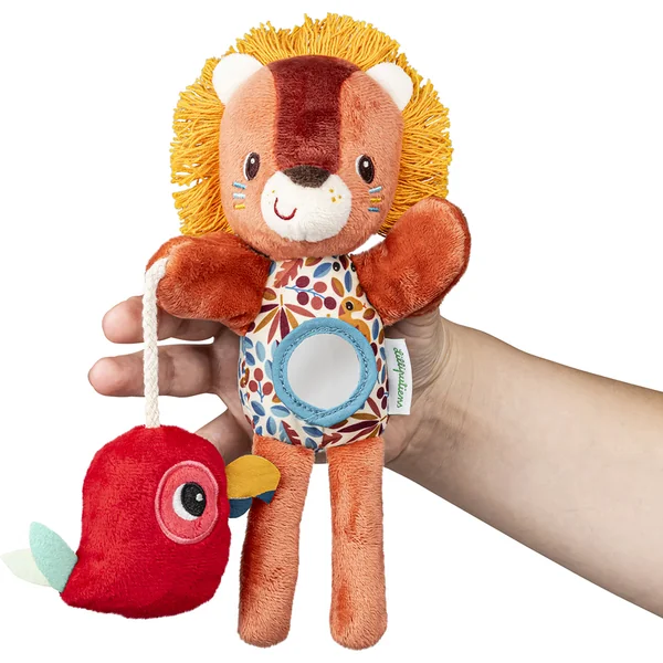 La marionnette avec le motif du lion Jack est idéale pour divertir les enfants à partir de 6 mois. La tête de Jack contient un hochet, un miroir rond sur le ventre et il a à ses côtés un petit perroquet rouge qui crisse. Cette marionnette en peluche est donc un jouet idéal pour stimuler la vue et l’audition du bébé, mais aussi sa motricité et son imagination. Elle peut être lavée en machine à 30 °C sur un cycle délicat.