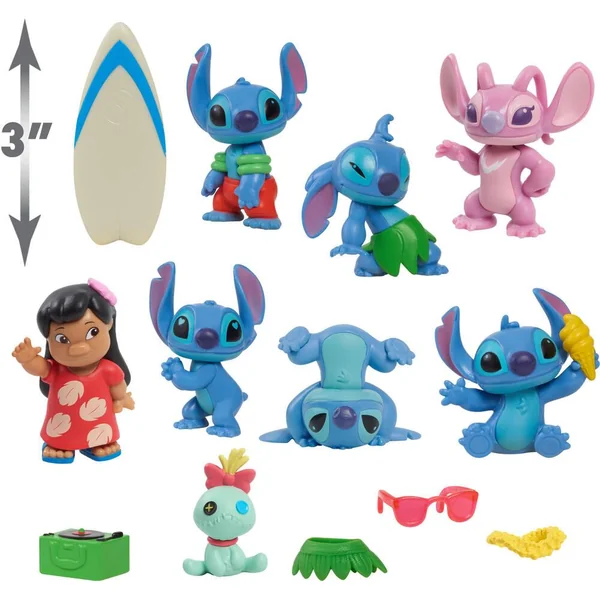 Comprenant Stitch dans cinq looks différents, Lilo, Scrump, Angel, ainsi que plusieurs accessoires de jeu tels qu’une planche de surf et un lei, chaque figurine est soigneusement conçue pour capturer l’énergie dynamique des personnages. Mesurant environ 7,7 cm de haut, ces figurines sont idéales pour les petites mains et stimulent l’imagination débordante des enfants.
