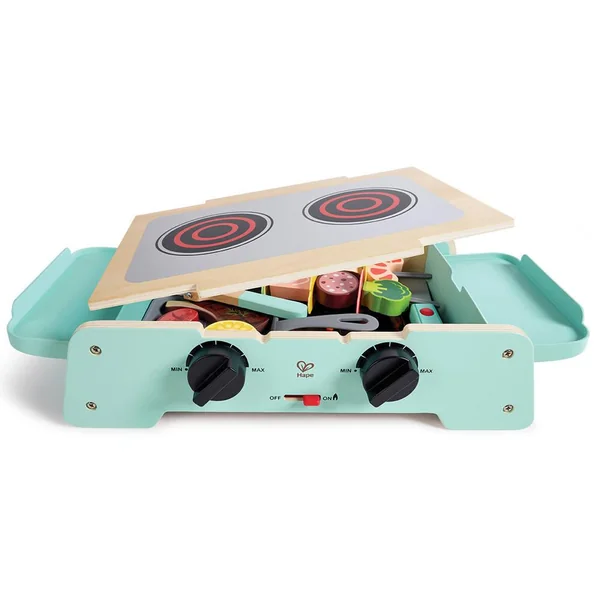 Set de barbecue et plancha, qui fait également office de réchaud ! Avec effet feu de charbon vacillant et son de grésillements.
