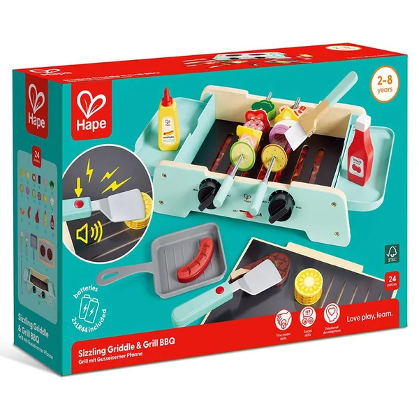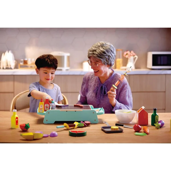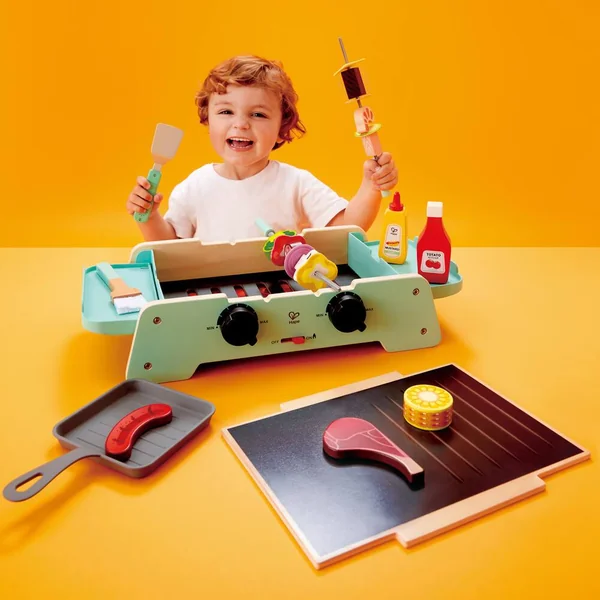24 pièces dont une spatule, une pince, une brosse, un plateau avec poignée, une salière et une poivrière, ainsi que des saucisses, des côtelettes d’agneau, du saumon et d’autres aliments délicieux !