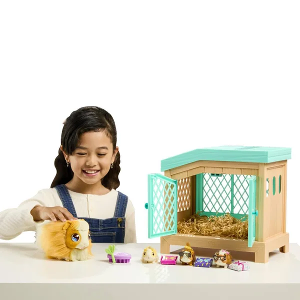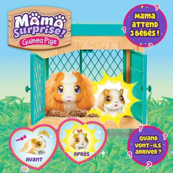 Animal interactif s’anime avec plus de 30 sons et réactions lorsqu’il est soigné. Brossez sa fourrure douce ou nourrissez-la avec les accessoires inclus et elle répond avec les sons les plus doux. Lorsque le cœur de la maman cobaye commence à briller, il est temps de la replacer dans son clapier de luxe, installé parmi le matériel de nidification. Les enfants peuvent se coucher étourdis par l’anticipation et se réveiller le lendemain matin avec une surprise : un nouveau-né cochon d’Inde ! Les surprises continuent alors que Mama Surprise met au monde un nouveau bébé cochon d’Inde chaque jour pendant trois jours consécutifs. Chaque bébé est livré avec son propre ensemble de soins spéciaux et des accessoires à thème comme le rock n’ roll, le preppy et la princesse pour un jeu de style sans fin.