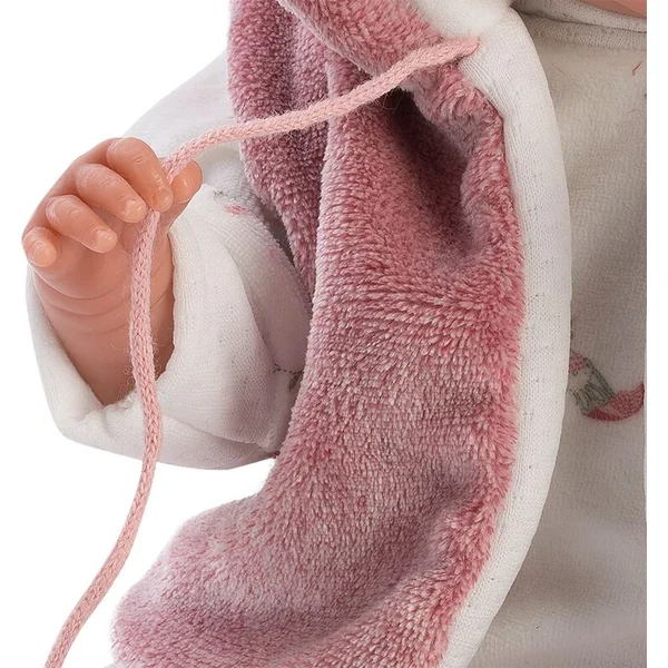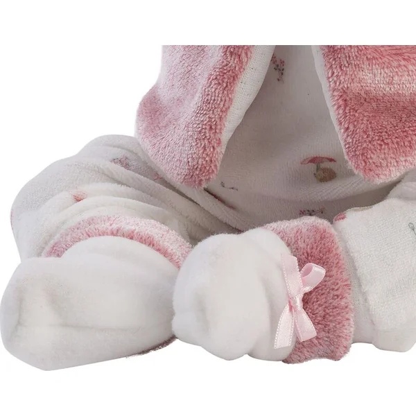 Mimi est habillée d’une combinaison en velours avec un motif d’animaux de la forêt portant des parapluies, de chaussettes douces au toucher avec de la fourrure et des nœuds, ainsi que d’un bonnet blanc et d’un body duveteux avec une capuche rose sale. Les combinaisons se ferment à l’arrière avec du velcro, ce qui facilite le changement de la poupée. Le ventre en tissu de la poupée est rempli d’une doublure douce et lorsqu’on le presse, la poupée commence à rire.