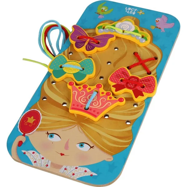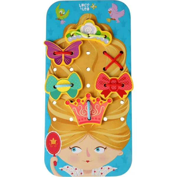 La princesse est un ensemble de lacets et de perles en bois avec 31 pièces en bois et 4 lacets. Il comprend un grand plateau sur lequel est représentée la tête d’une adorable princesse avec des cheveux soigneusement coiffés en une belle coiffure, qui doit encore être décorée avec de nombreux accessoires colorés.
