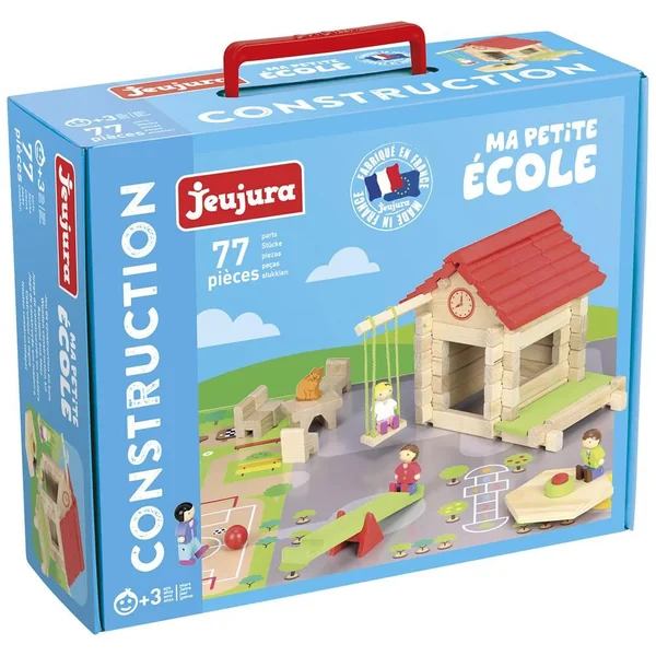 Ma Petite Ecole – 77 pièces en bois : Jeu de construction en hêtre massif pour réaliser une première construction en bois et jouer avec tous les accessoires, avec un tapis de jeu. Une notice de montage facile d’utilisation pour les plus jeunes accompagne le produit. Valisette carton : 32 x 27 x 11 cm.