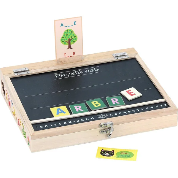 47 lettres et 23 chiffres en bois, 50 cartes modèles pour essayer de reconstituer des mots en français et en anglais et 30 cartes pour faire ses premières additions et soustractions. 2 craies viennent compléter ce set bien fourni. Et 12 bons points pour récompenser les doudous bien sages ! Un set indispensable pour stimuler les enfants dès 4 ans. • un pupitre en bois. • 47 lettres de l’alphabet. • 23 chiffres et signes. • 80 cartes modèles pour l’apprentissage de mots en français et anglais. • 30 cartes modèles pour effectuer des additions et soustractions simples. • 12 cartes bon point. • 2 craies.