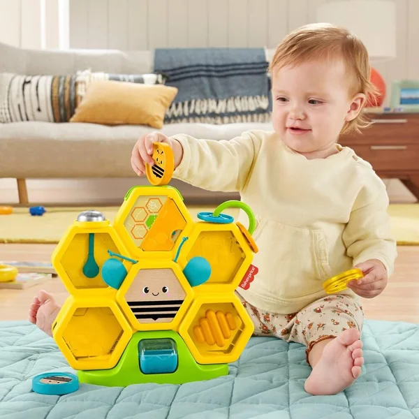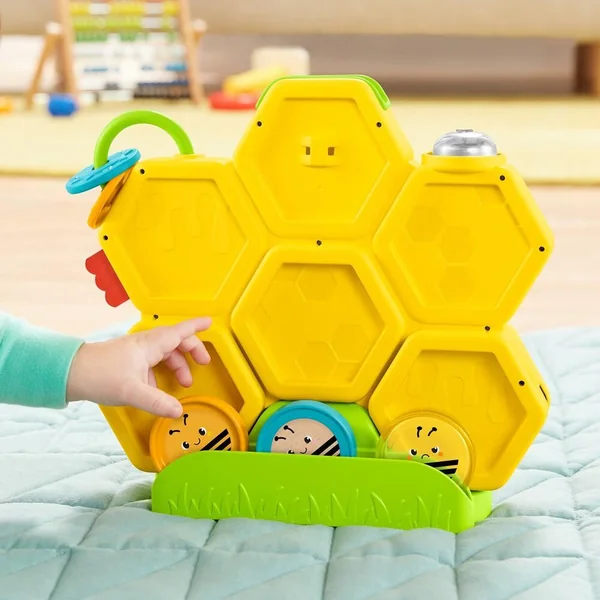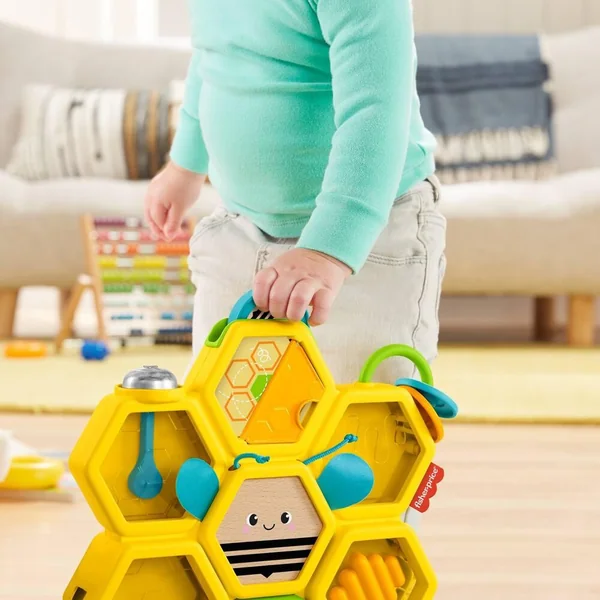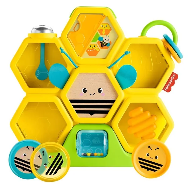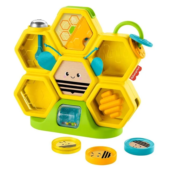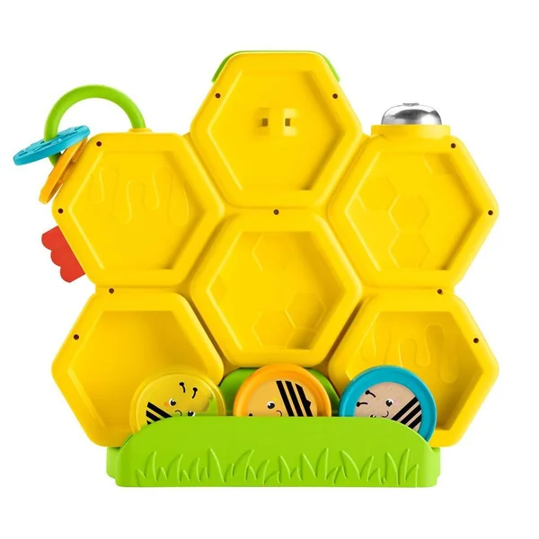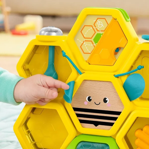 Une ruche aux différents matériaux (bois, plastique et tissu) pour éveiller bébé. Equipée de 3 jetons en forme d’abeille, cette ruche propose à l’enfant de découvrir le son de la cloche et de développer sa motricité fin en laissant glisser ses jetons à l’intérieur de ce labyrinthe. L’enfant verra son jeton glisser d’un côté ou d’un autre et ressortir.
