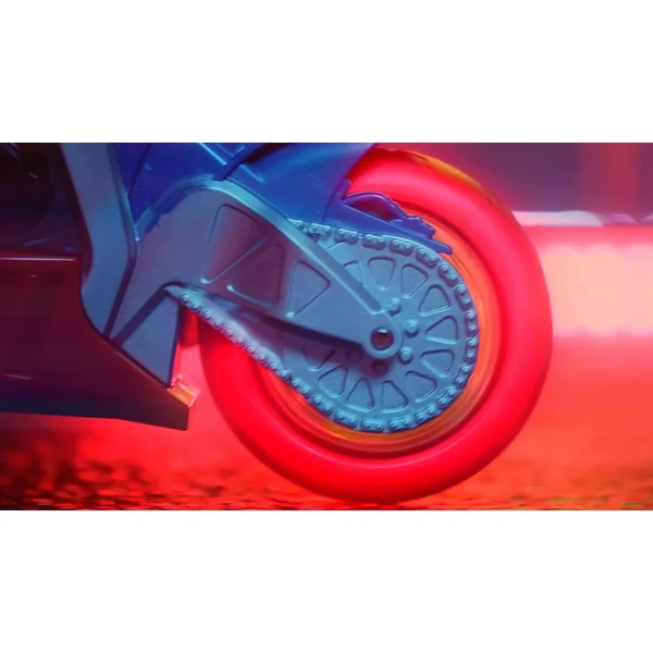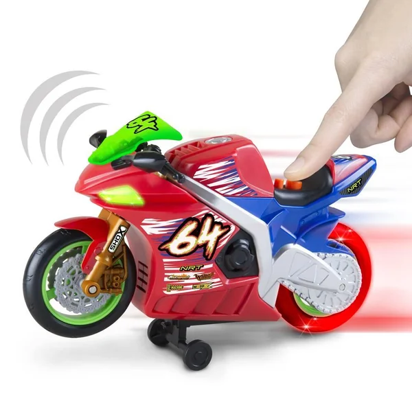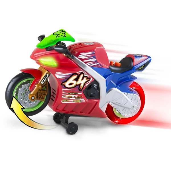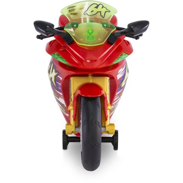 Moto de 25 cm avec effets sonores et lumineux. La roue arrière s’allume en rouge quand la moto fait du wheeling : avance sur la roue arrière uniquement. Avec des phares fonctionnels, des effets sonores et de la musique. 3 piles LR6 fournies. Fonction Try Me. Instructions imprimées sur la boîte.