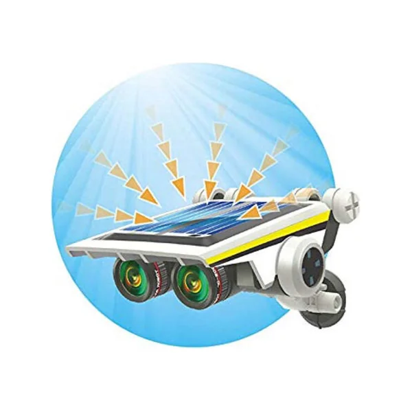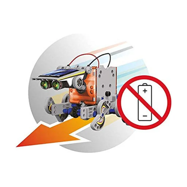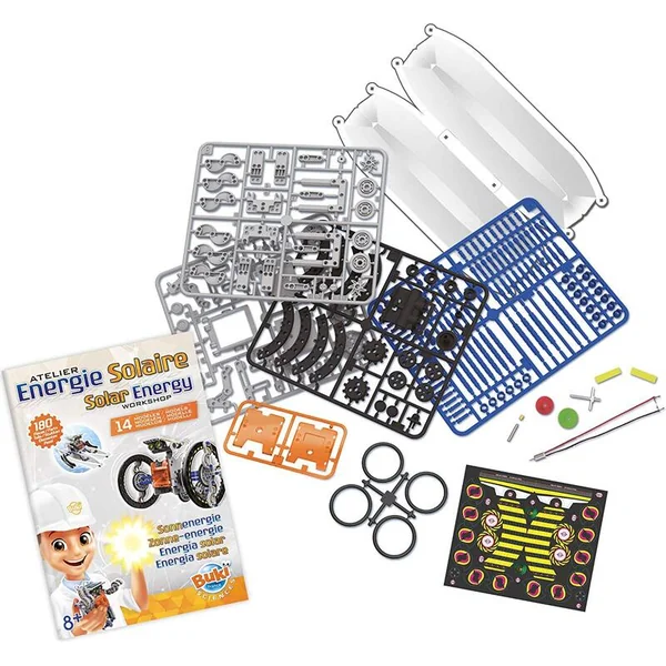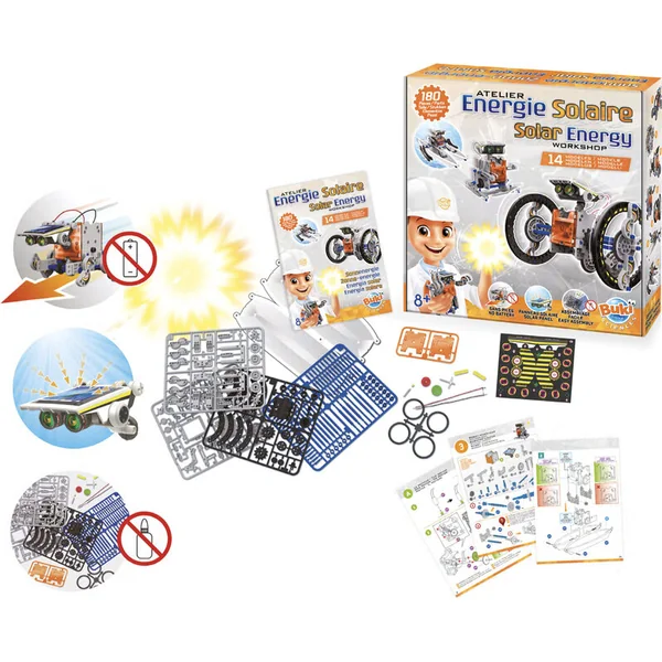 Assembler un modèle prend environ 30 à 60 minutes et nécessite une certaine habileté manuelle, éventuellement avec l’aide (surveillance) d’un adulte. Une fois le modèle assemblé, testez son fonctionnement sous la lumière du soleil ou avec une ampoule plus puissante. Le kit montre la capacité de transformation de l’énergie solaire en énergie électrique et différents types d’entraînement mécanique.