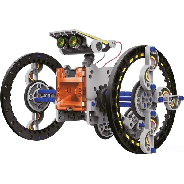 Kit électronique avec entraînement solaire. Assemblez l’un des 14 modèles possibles, que vous mettrez en mouvement grâce à l’entraînement moteur et à l’alimentation par panneau solaire.