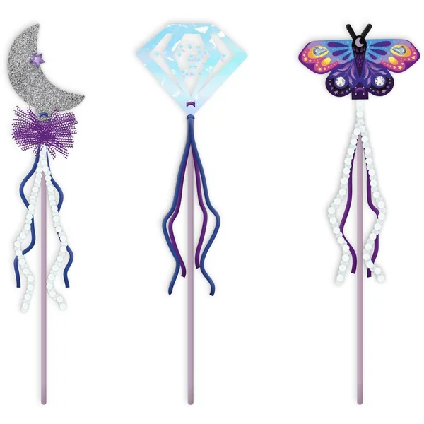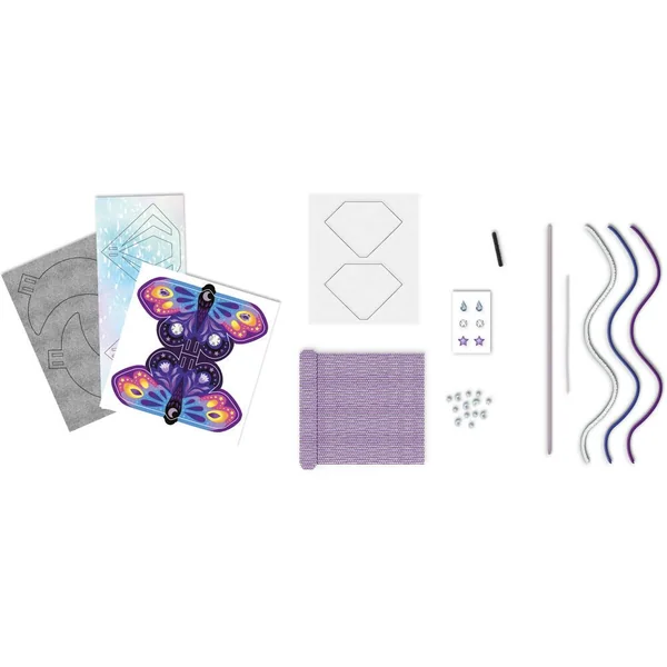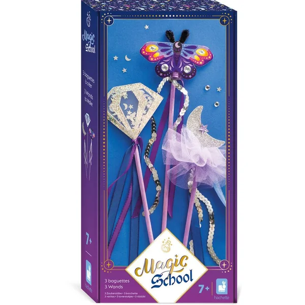 Abracadabra ! Ce kit créatif permet de réaliser 3 baguettes de sorcières ! Il est composé d’une planche prédécoupée pailletée argentée, 1 planche prédécoupée holographique, 1 planche prédécoupée imprimée, 1 planche prédécoupée transparente, du tulle violet, 45 sequins étoiles et lunes, 6 sequins autocollants, 1 fil chenille noir, 3 baguettes en bois teinté, 1 ruban de sequins argentés, 2 rubans de satin (bleu et violet), 1 fil élastique, 3 carrés de mousse autocollante et 1 livret avec les instructions et les modèles. Cette activité permet de développer sa créativité et sa motricité fine et est idéale pour les enfants à partir de 7 ans.